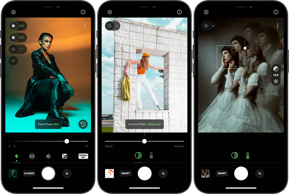 Appen har för fotografering två lägen, Smart och Classic. Smart ska vara enklare att använda; med Smart-TTL kan man kontolera vilken stil man vill ha. Appen ställer in exponering och kontrollerar blixtarna. Slutartid, iso, vitbalans och liknade ställer programvaran in. I Classic har användaren mer kontroll över funktionerna.