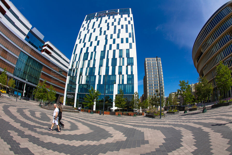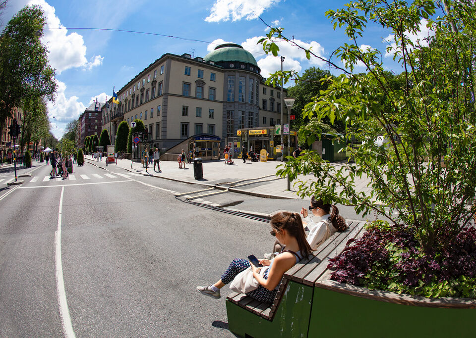 Vy från Sveavägen/Observatorielunden i Stockholm under tillfälligt bilfri helg i somras, handelshögskola i bakgrund. beskuren Canon EF fisheye 15 mm