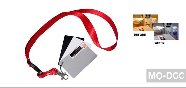 3 stycken gråkort i plast på nyckelband för vitbalansering.-Ett svart, ett vitt och ett grått kort ingår.