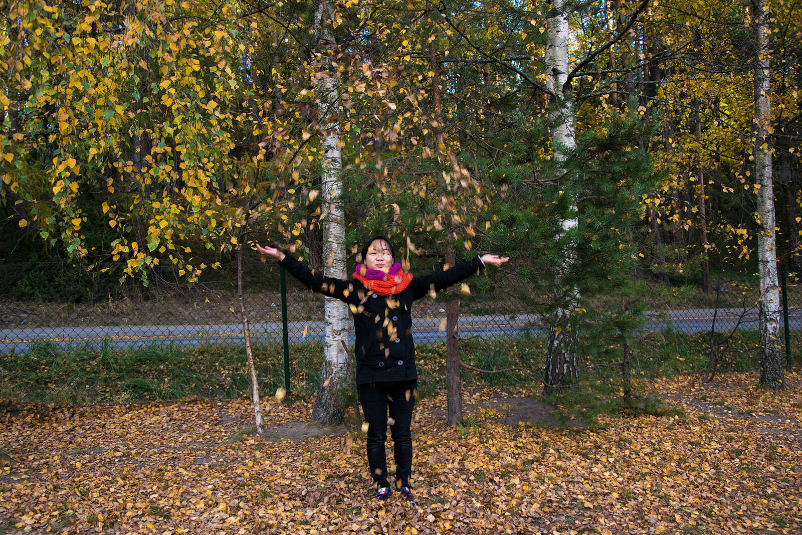 Min ide var att fånga upp en känsla på bilden genom att min bästis skulle kasta upp löv i luften. Det hade jag lyckats bra på mitt första försök. Tyvärr så märke jag också att björkträdet i bakgrunden väckte till mig mest när jag såg på bilden. Vilket var störande för mig personligen.