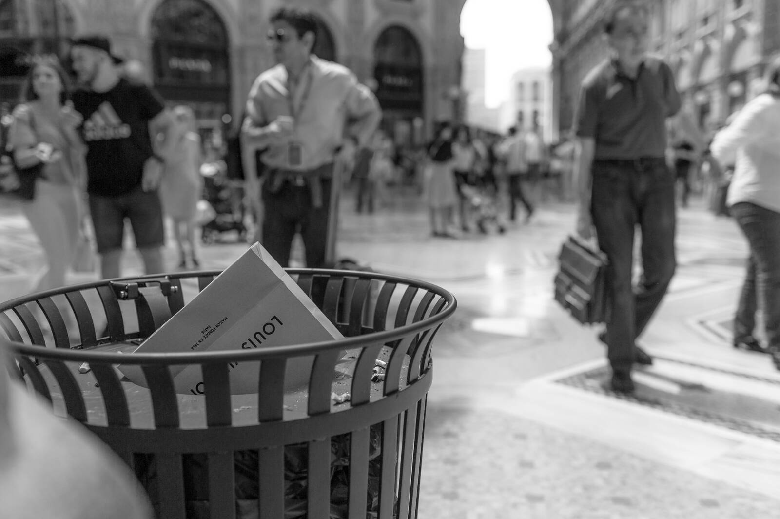 Försöker få huvudfokus på papperskorgen och dess innehåll. Bakgrunden ville jag ha subtil, platsen är den kända Galleria Vittorio Emanuelle i Milano vilket jag inte låg vikten av bilden på.