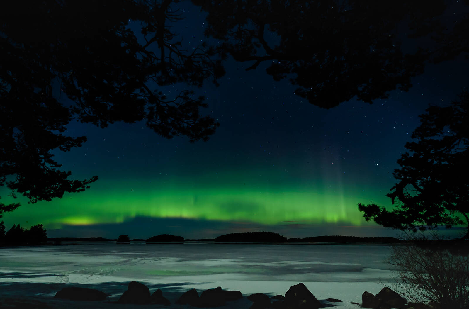 DJUP I BILD; Tycker att bilden har djup i sig? Att fota norrsken är otroligt lärorikt och väldigt svårt om det ska bli bra. Att framkalla bilderna är ännu svårare. Skärpa i mörker, rätt slutartid och rätt ISO som hela tiden skiftar beroende på hur starkt skenet är. jag har lärt mig otroligt mkt att kunna använda kameran manuellt genom alla dessa väldigt många norrskensutflykter jag gjorde förra vintern. när jag kikar på just den här bilden så tror jag att borde ha sänkt slutartiden en eller ett par sekunder? Men nu var det ju djup som gällde. Kan det vara en lång horisont med förgrund kanske