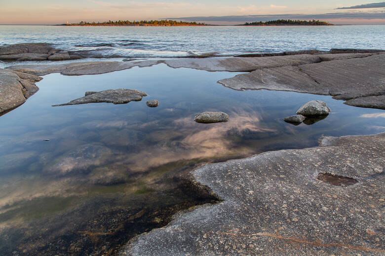 Jag var och tältade i fredags. Fint ljus var det, men inte så himla lätt att komponera ut i hällarna. Tycker det är svårt med djupverkan i liggande bilder. Horisonten blir ofta smal vilket jag tycker stör. Skickar i alla fall denna bild där jag försökt bygga bilden med fokus på förgrund men att ögat ändå skall dras utöver vattnet.