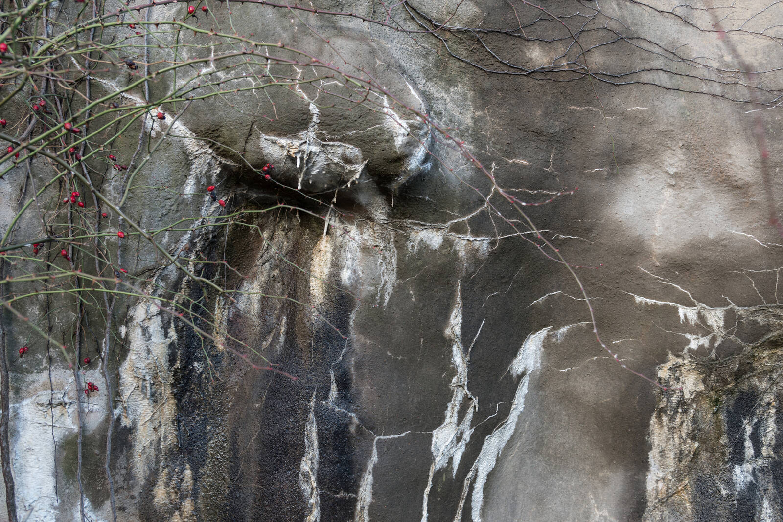 En bergsvägg som är "putsad" med något och sedan har rinnande vatten orsakat utfällningar av olika ämnen som bildat detta mönster.