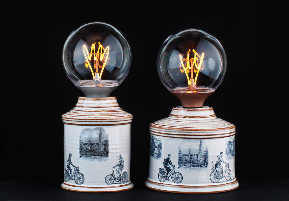 Reflexerna i lamporna var så stökiga att jag till sist monterade ihop tre bilder, en med släckta glödlampor och softboxar, en med bara tända lampor och en med ljussättning. För att undvika knasiga speglingar är varje ljussatt lampa fotad för sig och sedan ihopmonterad i Fotoshop.