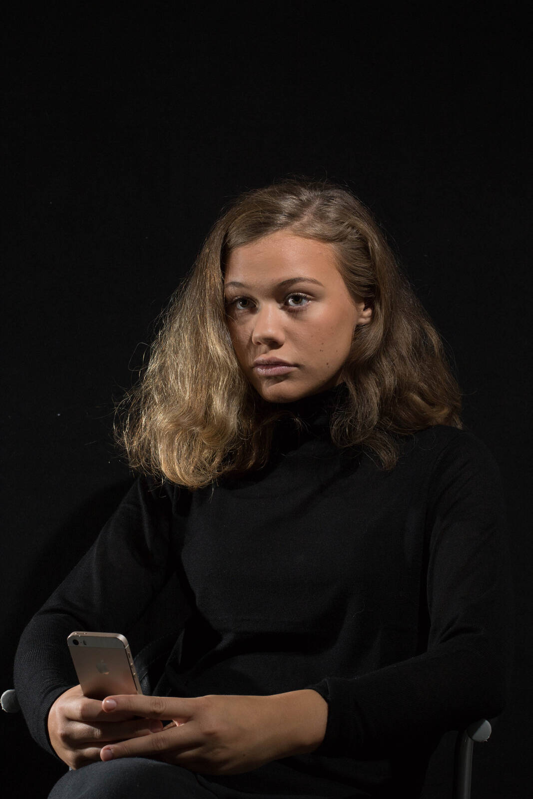 Min dotter fotograferad med två Speedlightblixar utan diffusering i ett slags korsljus. En blixt är placerad ganska högt framifrån min dotter (något till höger sett från fotografen). Den andra blixen är placerad på golvet på motsatt sida bakom min dotter för att lysa upp håret och händerna något. Jag hade även en reflektor på golvet framför dottern för att lätta upp skuggorna i ansiktet.