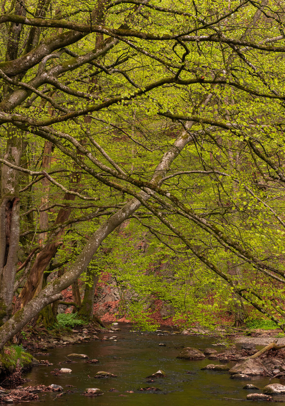 Tanken med bilden är att kombinera vatten, nyutslagna löv och i bakgrunden skymtar man lite av båda fallna boklöv och ravinen.