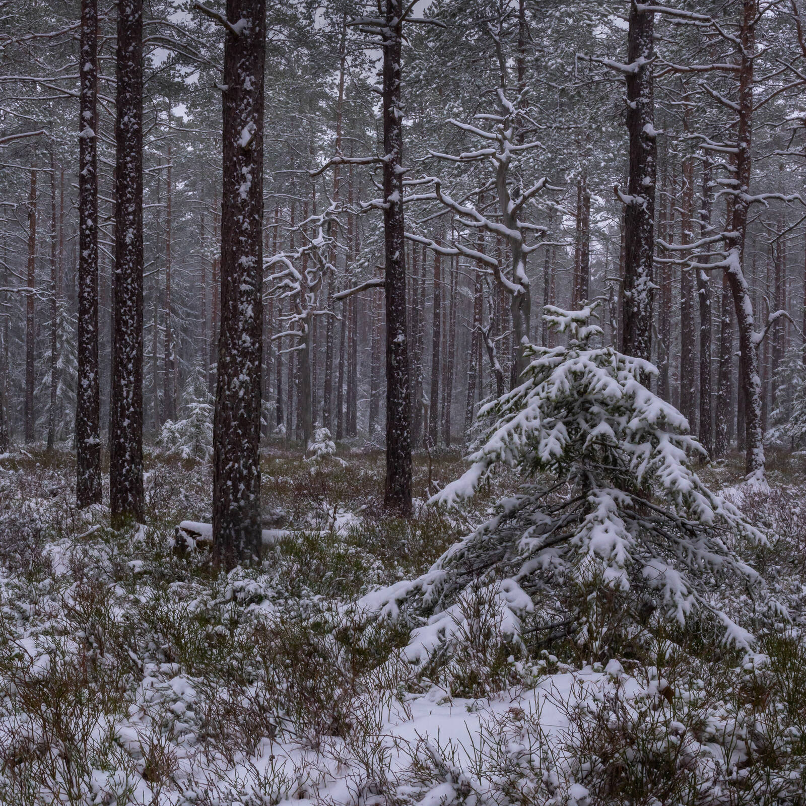 Bilden tagen torsdag morgon den 21 februari strax utanför Bodafors i Småland. Det har nu snöat hela natten och det snöar fortfarande. Jag tycker om vildmossen som jag kommit ner till men vänder mig nu bakåt istället för ut mot mossen. Vill få med mig landskapet hem med torr furorna och tallskogen. Kan uppleva att kanske granen är lite för stor i förgrunden. Gillar också blåbärsriset som sticker upp ur snön som en matta.