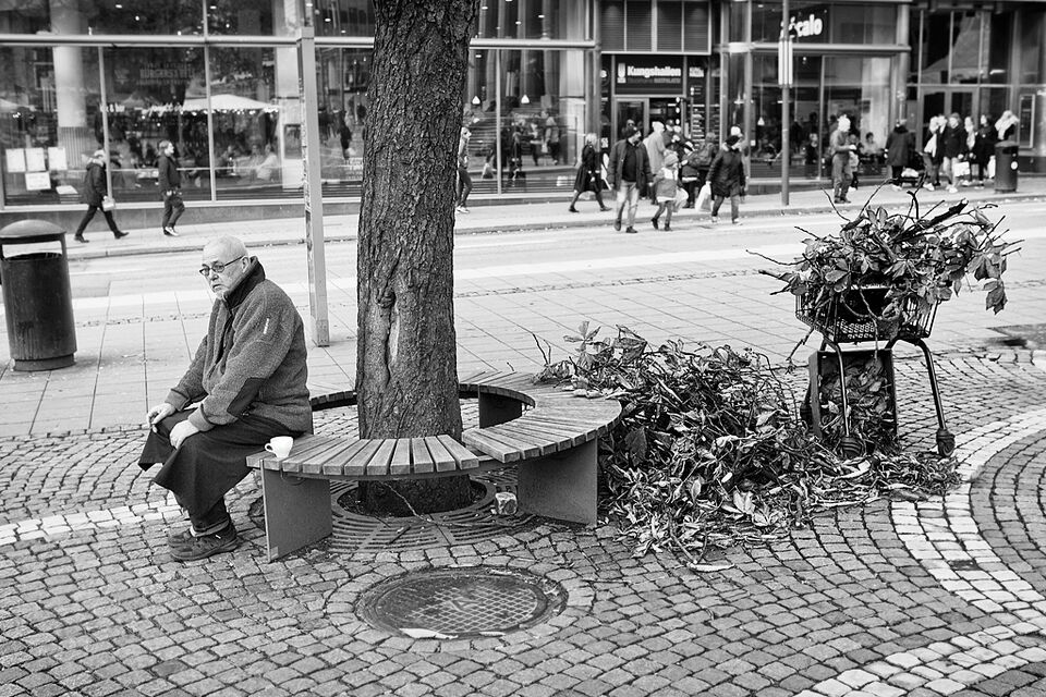 Dagarna blir kortare och ljuset sparsammare. Ofta skymning middagstid. Bilden från Hötorget med en stor hög av torkade löv och brutna grenar. Någon har försökt samla det i en shoppingvagn och i ett ... läs mer..