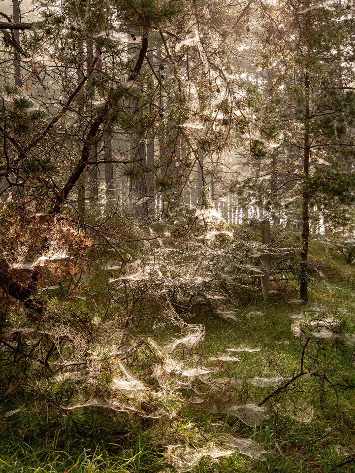 Bilder från den gångna sensommaren, tiden då spindelnäten börja träda fram mer synligt. Militär skog vid Åhus, tall