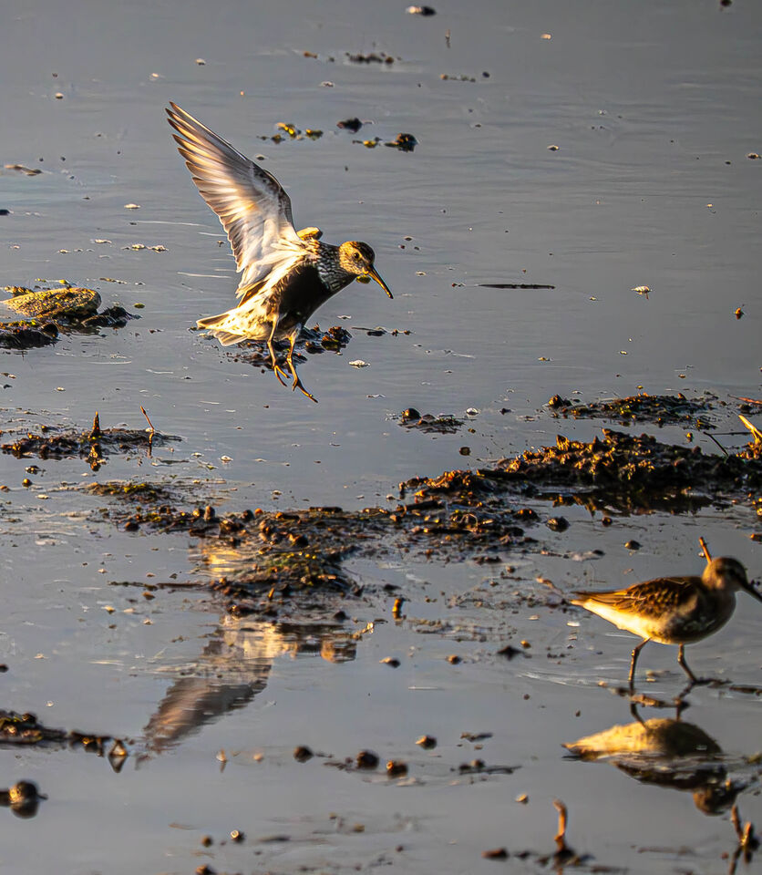 Från Augusti, Korran, tidigt om morgonen. Lite spridda fåglar, antalet har ju börjat minska mot hösten till, men det är ändå gott om fågel. Solen står lågt. Kärrsnäppor.
