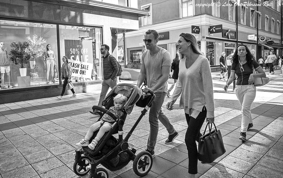 Drottninggatan i Stockholm sensommar 2017 EF 24-70L - 24 mm det här bild visar dom verkar som kändisar ser ut som lika Alexander Skargård och Tuva Novotyn blev upptäckt och skrattar.. Nej, skämt o ... läs mer..