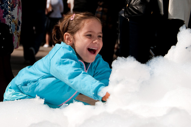 Den här flickan tyckte skummet från en fontän var mycket mera roligare att leka med än att titta på alla studenter. läs mer..