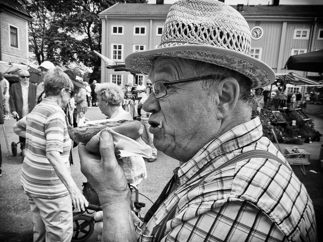 Nu börjar marknadssäsongen med fina möjligheter till gatufoto. Årets premiär var i Malmköping för min del. Den lilla idylliska orten som annars ligger öde blommade upp med sprudlande folkliv.