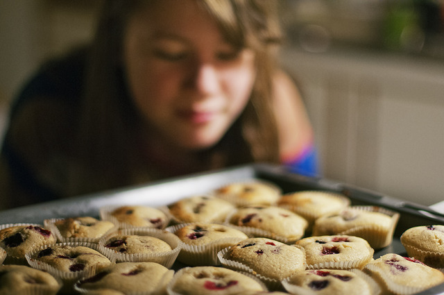 Ett infall fick jag och dottern, och bakade muffins! Vi fick användning av de björnbär vi sparat för något speciellt ändamål, några hallon kom också till nytta i detta sena nattbak.