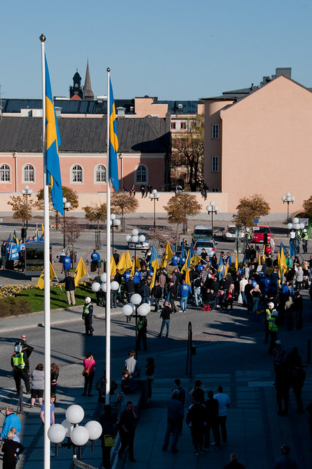 Idag var det fullt pådrag utanför mitt vardagsrumsfönster, polisen hade fullt upp att hålla isär dom olika demonstranterna.