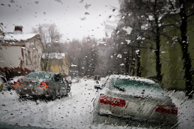 I dag på morgonen blåser det friskt i Gnesta och blötsnön faller utanför huset.