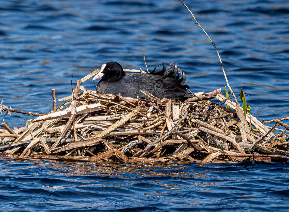 Också från Magle dammar, fortsättning från bilderna igår tagna 5/5. Det är bobyggartider, startar med sothönan som tronar på sin egen ö.