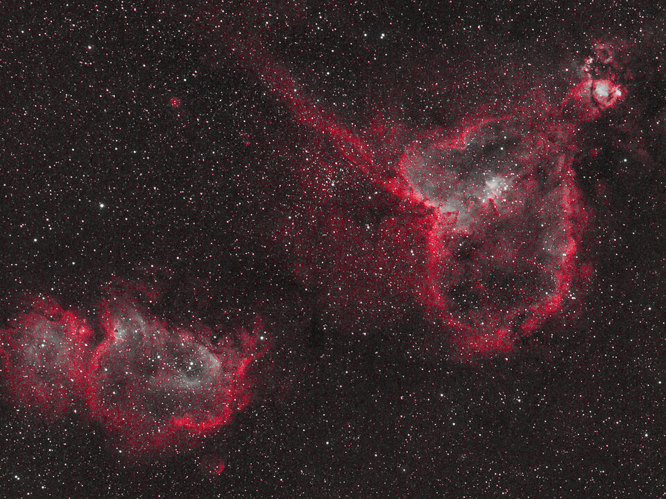 Heart and Soul, ligger 7500 ljusår bort, emissionsnebulosor och lyser starkt rött från upphettad vätgas. Hjärtat är ung 200 ljusår brett och själen 150 ljusår.