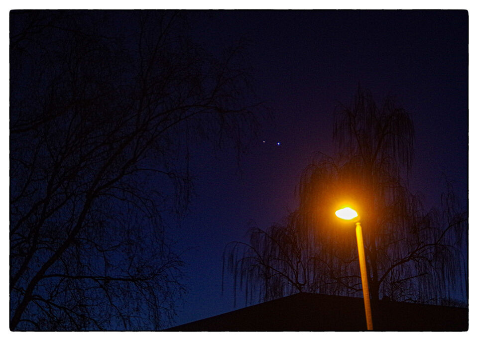 I kväll ser dom nästan som närmast ut, c:a 44 bågminuter åtskilda. Minimum inträffar någon gång under morgondygnet med minsta vinkelavstånd 40 bågminuter. Jag tog bilden nedan 18.45 i dag och ... läs mer..