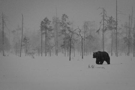 Denna bild av björn i ymnigt snöfall, när den långsamt närmar sig den öppna delen av myren, är just den ... läs mer..