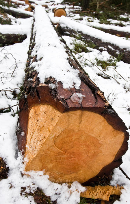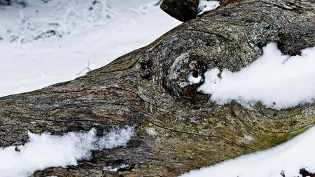 Kärnved i tallstock, Hirvensalo 2 februari 2008. Foto: Håkan Eklund. Passade på att fotografera en skogsavverkning på ön innan all snö har regnat bort. Snön skapar en intressant profil kring allt ... läs mer..
