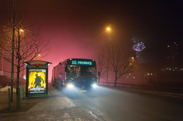 Jag som gillar kollektivtrafik brukar försöka fota någon buss men fyrverkeri i bakgrunden om jag kommer åt, antingen vid 12-slaget eller inom den närmaste stunden.