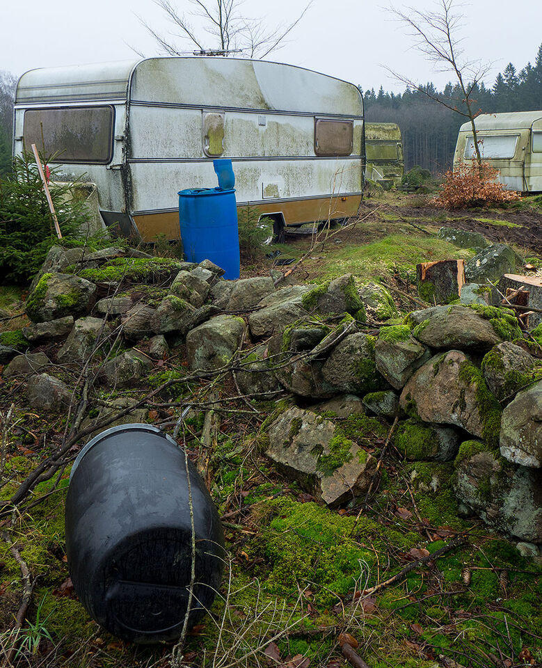 Det här är väl fult? Risiga husvagnar, plasttunnor och ett färskt kalhygge. Varför fotograferar jag det? Vet inte, men jag ville.
