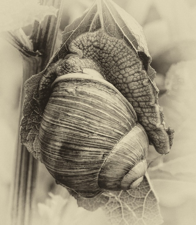 Vinbergssnäckan (Helix pomatia) trivs hemma. Här framställd i stilen "gammal bokillustration". Det är harmlösa små ... läs mer..