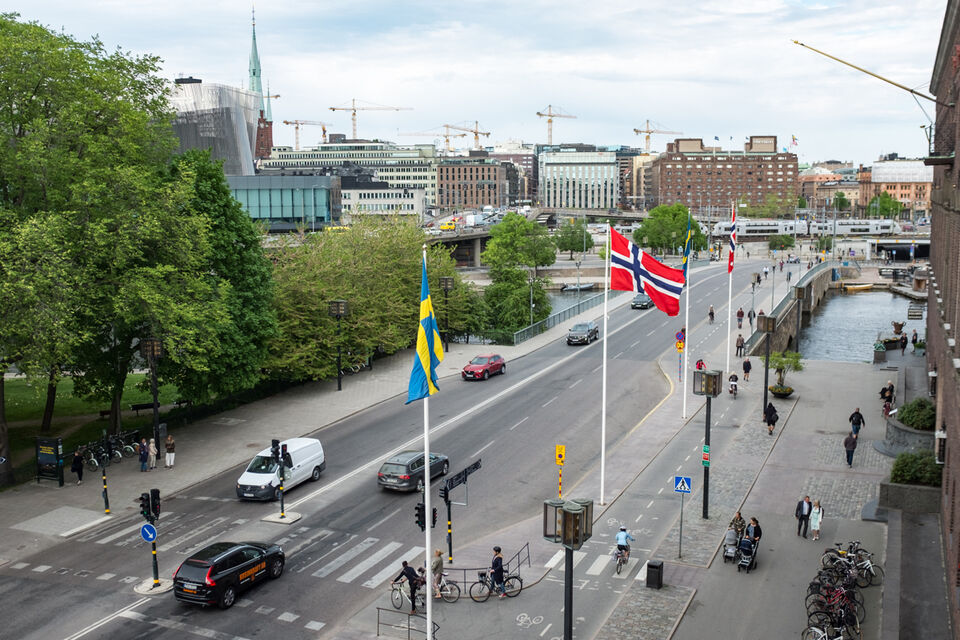 Norska och svenska flaggor vajar sida vid sida utanför stadshuset idag - det är syttende mai!