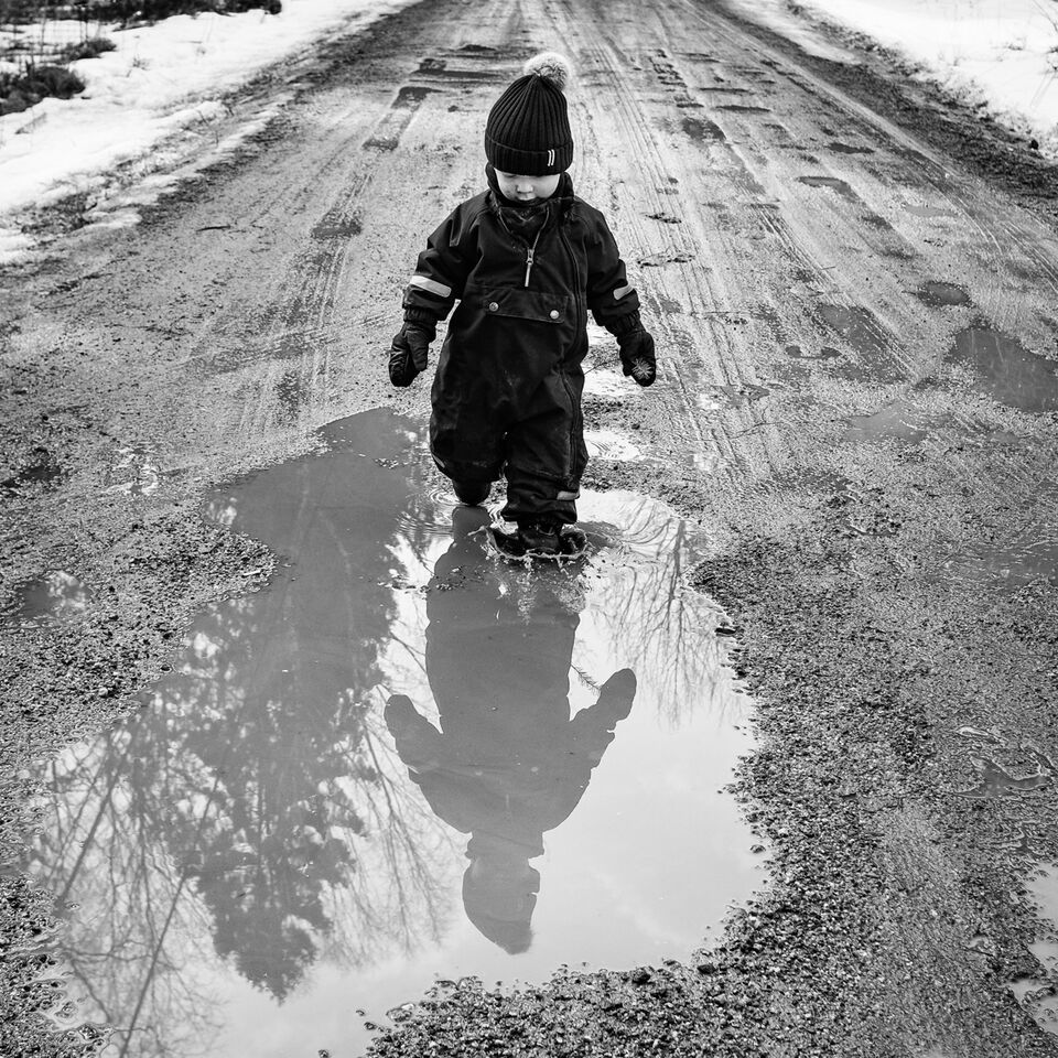 Vattenpölar är som magneter. För små barn. De måste liksom prova om det plaskar så där skojigt. I varje pöl. Visst minns man den glädjen att springa fort fort. Genom. Varje. Pöl. Man såg!