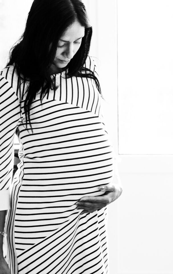 med ett litet flickebarn i en pärtkorg.