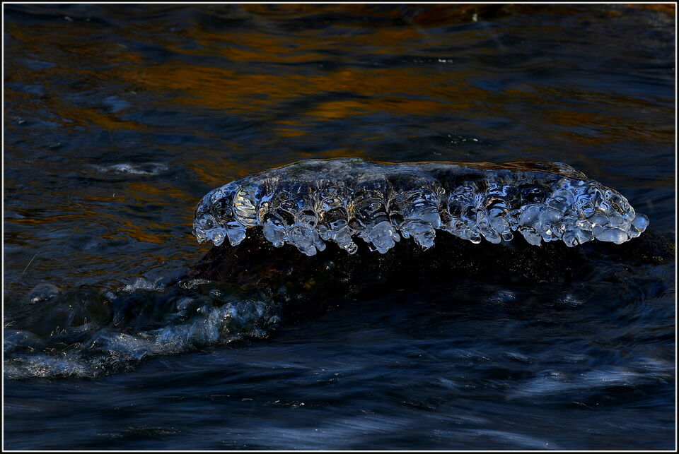 isbilder medan kylan håller i sig. Rinnebäck med forsar
