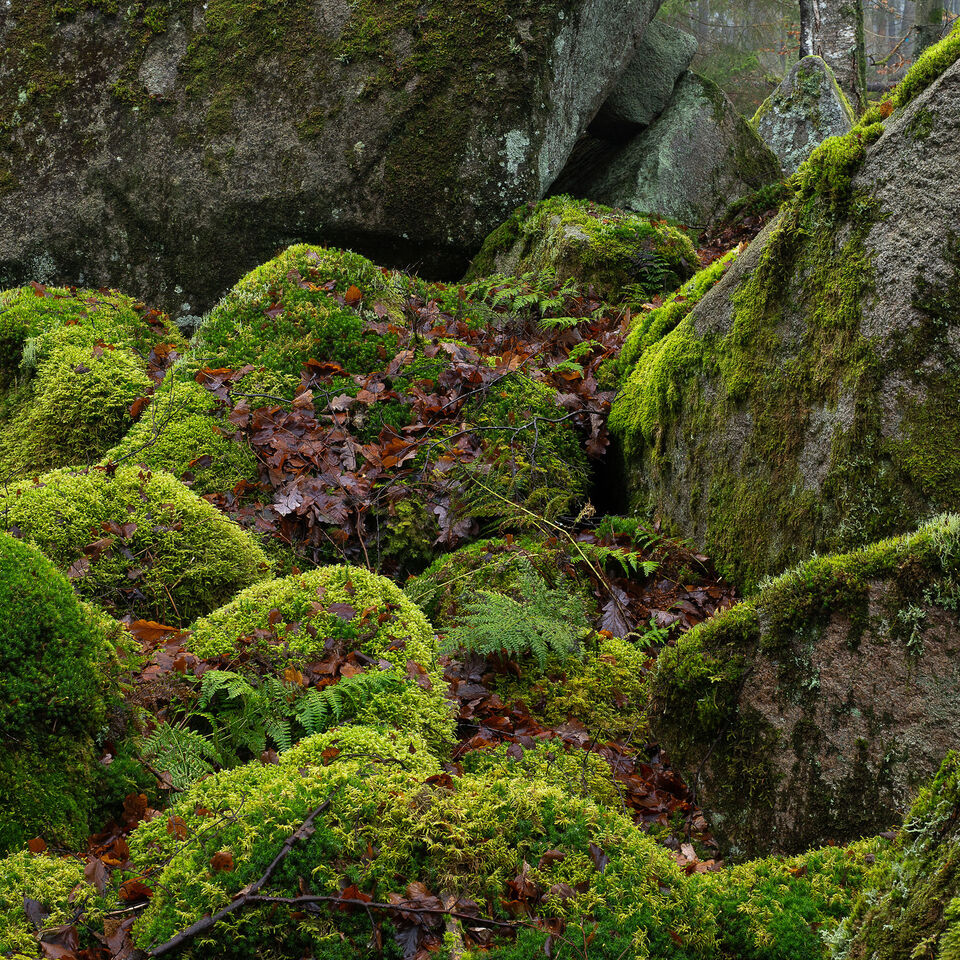 Det här är väl en rätt typisk bild för mig. Stenar, löv och fuktig mossa i en skog. Mjukt ljus. Från Pieboda naturreservat vid Halen i västra Blekinge. läs mer..