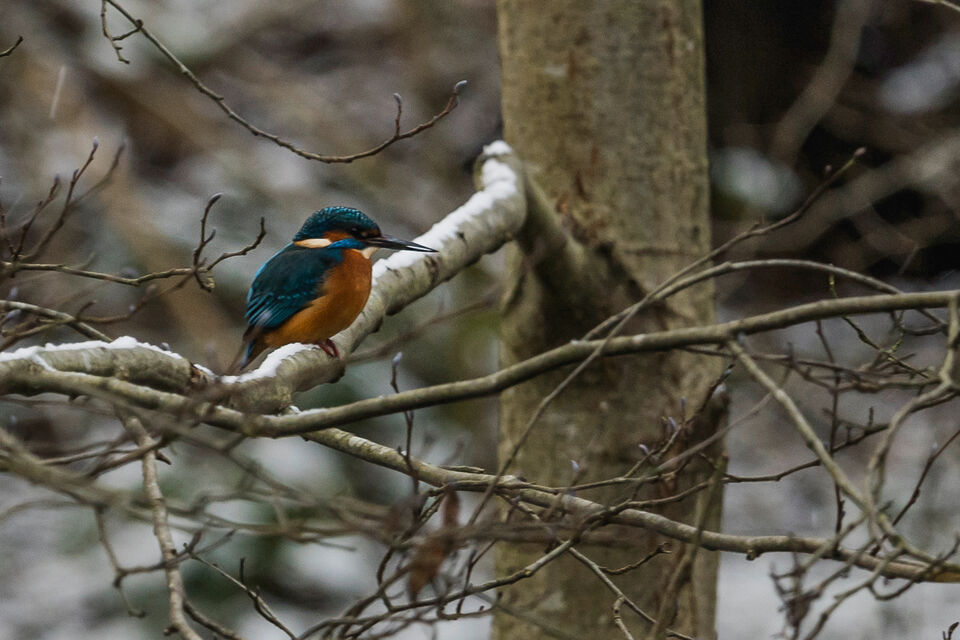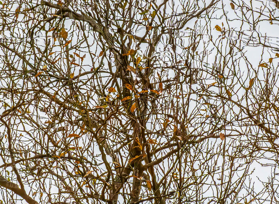 tillvaron är ju inte helt färglös nu, lite finns att se i träden, men illa mörkt för långa objektivet inne i skogen