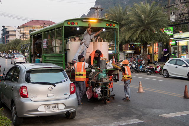 Här laddar man maskinen med färg från en behållare på lastbilen.