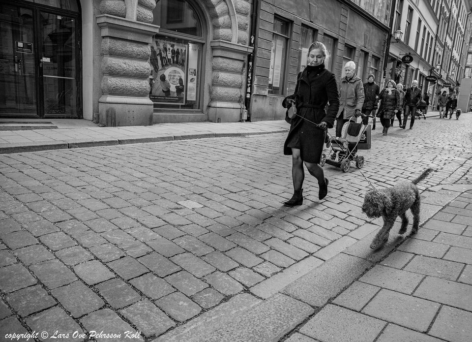 Västerlånggatan i Gamla stan i Stockholm, pinkpromenad kanske.. marsmånad 2017 EF 24-70L vid 24 mm ISO 1600 svartvitt konverterades i PS, tyvärr inte Nik Collection äldre Silver efex, gratisversion ... läs mer..