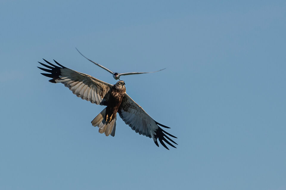 En brun kärrhök drog förbi, vilket inte uppskattades av tärnorna. Undrar om det är en svarttärna också, eller enbart ljuset ... läs mer..