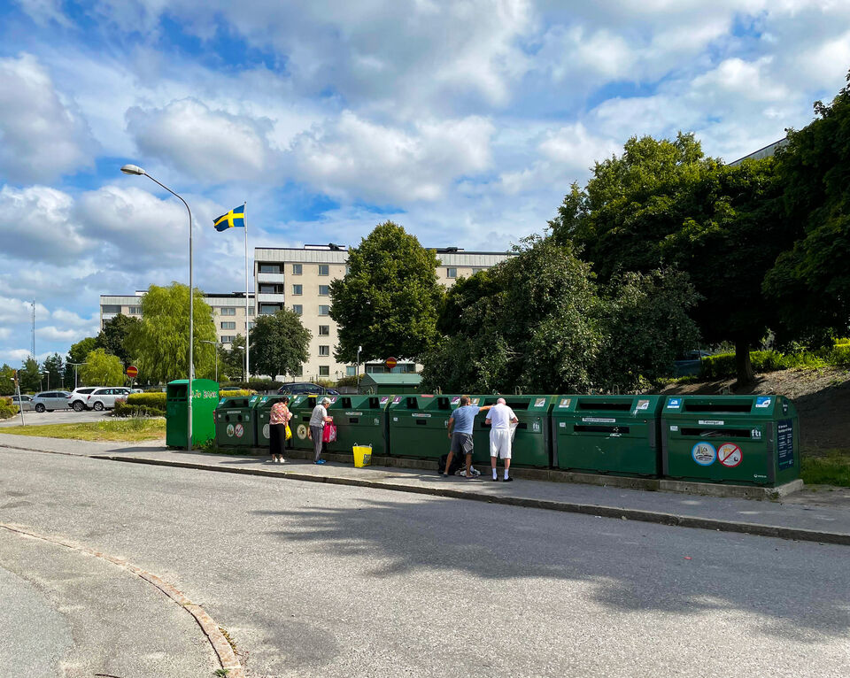 återvinningsstation på återvänd i hemområde. min iphone 12 mini togs här bild, beskären efter promenad... PS flaggdag idag är 8 augusti för Drottning Silva namnsdag. Hälsningar Lasse läs mer..