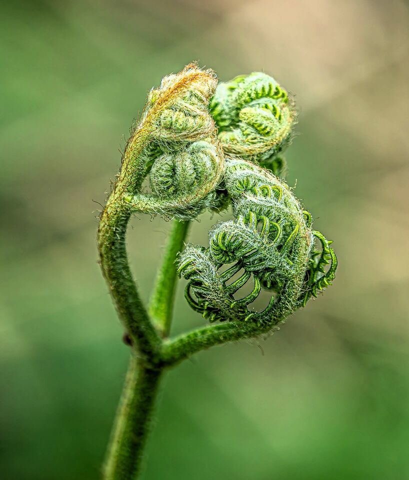 Ute i skogen med teleobjektiv 400 mm (800 FF) det går bra till mycket, men inte vyer. Startar med växterna, först bräken som håller på att vecklas ut, det är något särskilt med det