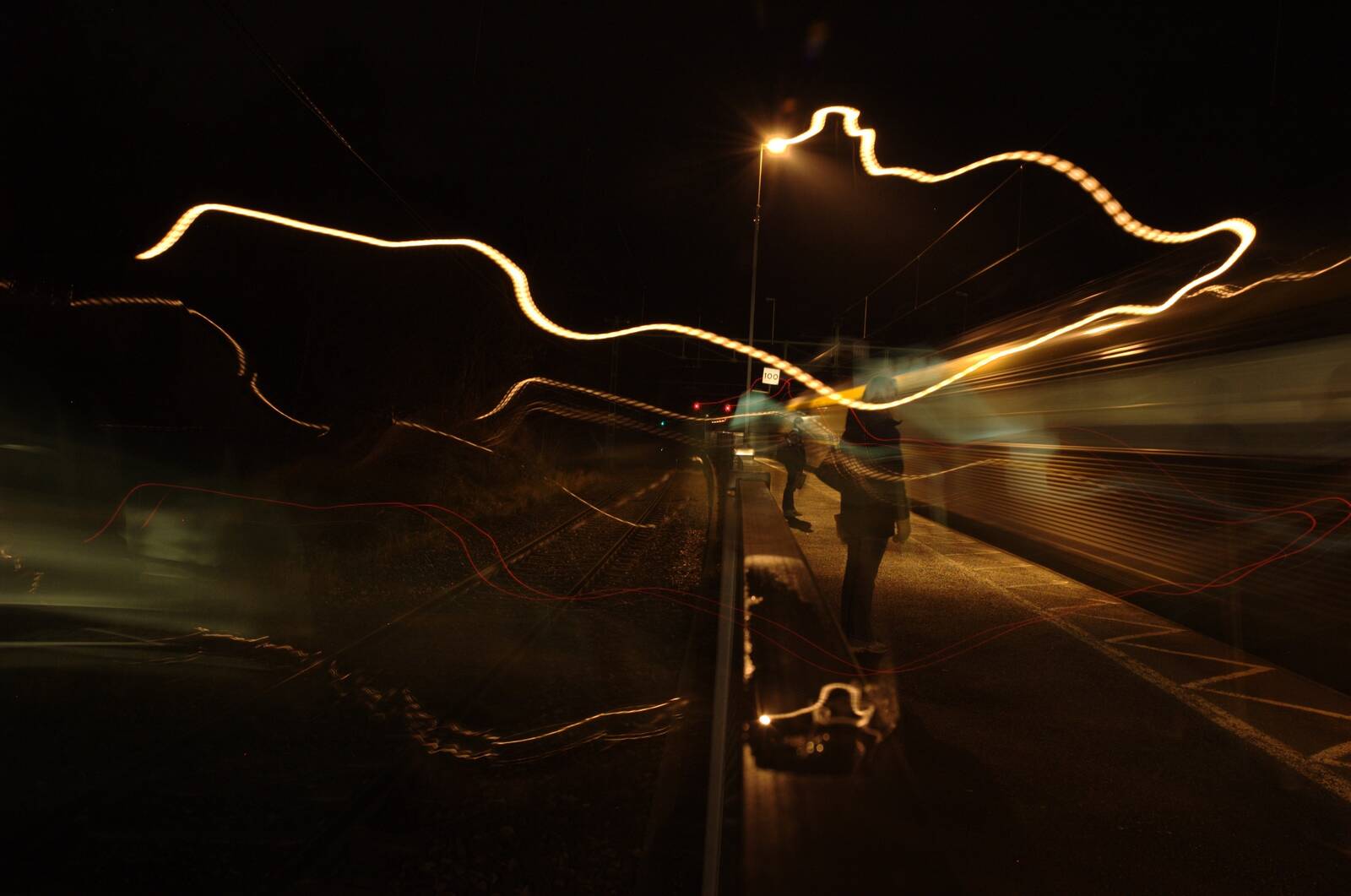Skulle ta bild med lång slutartid av ankommande tåg och hade balanserat min kamera på skyddsräcket mellan perrongen jag stod på och spåret vars trafik gick i motsatt riktning. Slutaren var öppen när jag insåg att ett tåg kom bakom mig på spåret bredvid, och jag fick hastigt rycka till mig kameran så att den inte skulle dras med/iväg av fartvinden. Oops - m a o!