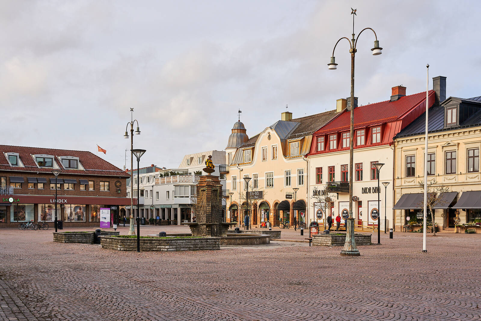 Stora torget i Falköping med statyn Malta Johanna iklädd en fotbollströja (Elfsborgs tror jag). Numer avtar centrumhandeln mer o mer och utlokaliseras till köpcentrum Ålleberg i utkanten av stan. Det är samma trend som på många orter nuförtiden.