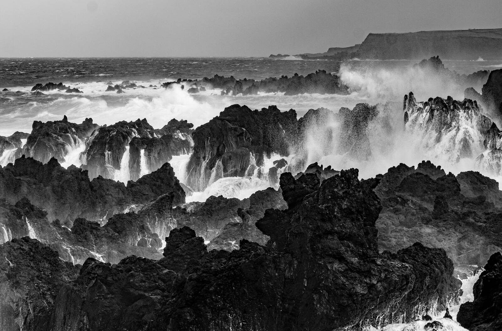 En stormig dag på ön Terceira Azorerna. Den här dagen i februari 2013 kom det varningar om hårda vindar runt Azorerna. Vår båt låg väl skyddad på läsidan så vi hyrde en bil för att se hur det var på andra sidan av ön. Ute på havet var det höga vågor och det blev ett mäktigt skådespel när vågorna slog mot de vassa svarta klipporna.