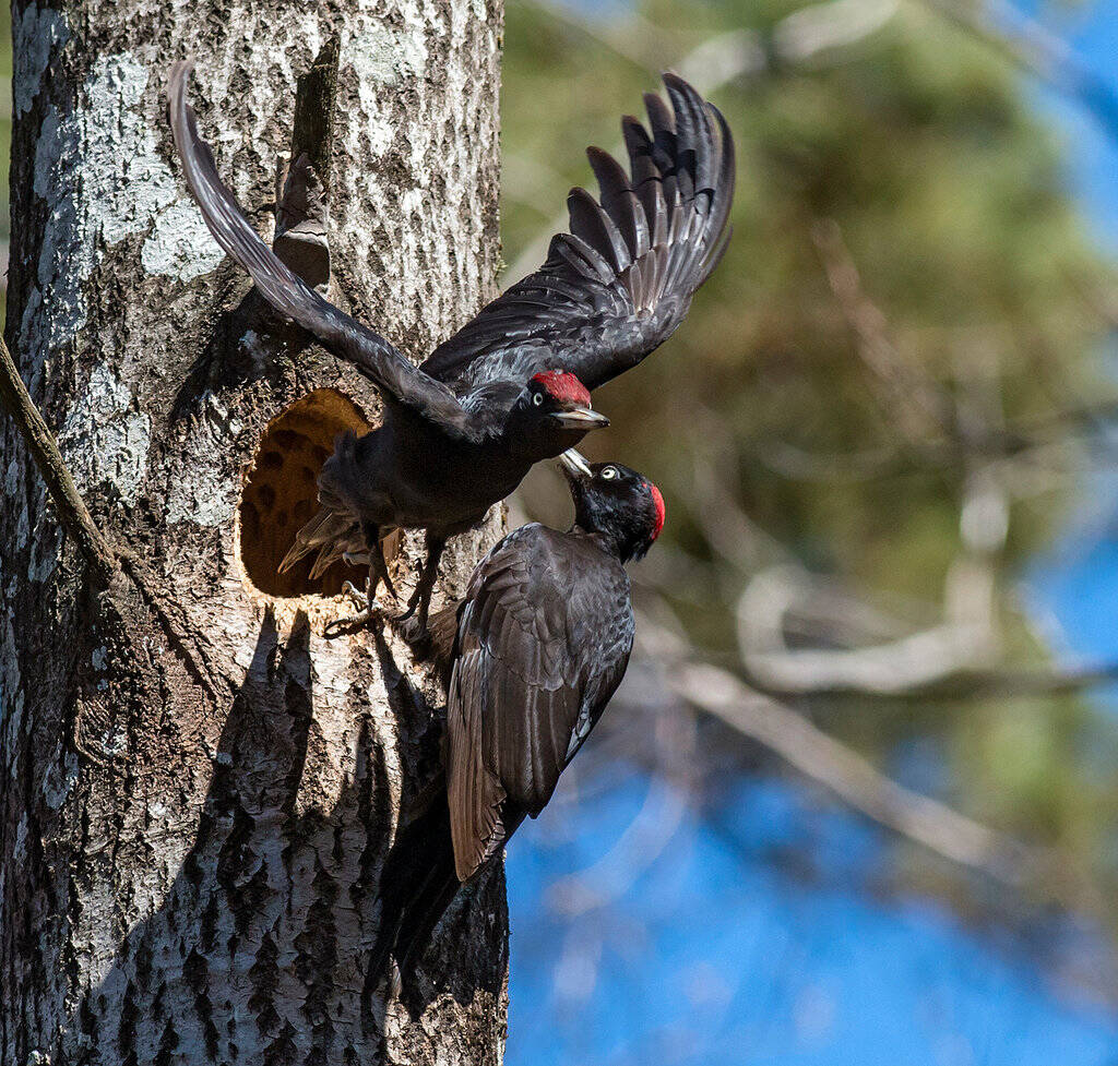 Har, som jag visat i tidigare bilder, nyligen stött på ett spillkråkebo. Jag passerar då och då boet på respektfullt avstånd och iakttar. Paret är nu efter färdigställandet av boet uppenbarligen inne i ruvningsstadiet – både hona och hane deltar i detta. Här har jag haft turen att kunna fånga hur paret avlöser varandra i ruvandet – honan har landat alldeles utanför boet och med ett speciellt läte under några ögonblick påkallat hanens uppmärksamhet och han lämnar det för att ge plats för henne i boet utan att bevärdiga henne en blick. Inga avskedspussar här inte.