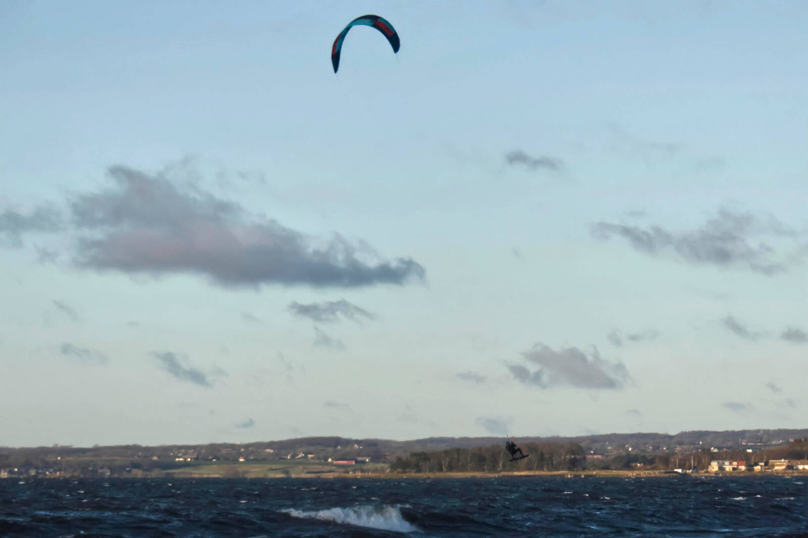 Det var en blåsig dag och tanken var att försöka fånga vågornas stänk på bild. Det visade sig att ett gäng vindsurfare samtidigt hade passat på tillfället att få blöta brädorna. En av dem nöjde sig inte med att fara fram i det våta elementet. Han siktade mot högre mål.