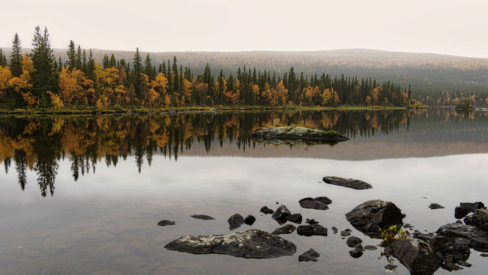 Bijelite är ett av många smultronställen längs Vildmarksvägen. Bilden tagen på väg till Saxnäs. Höstfärgerna fångas upp av mjuka ljuset, med fina reflektioner i det stilla vattnet.