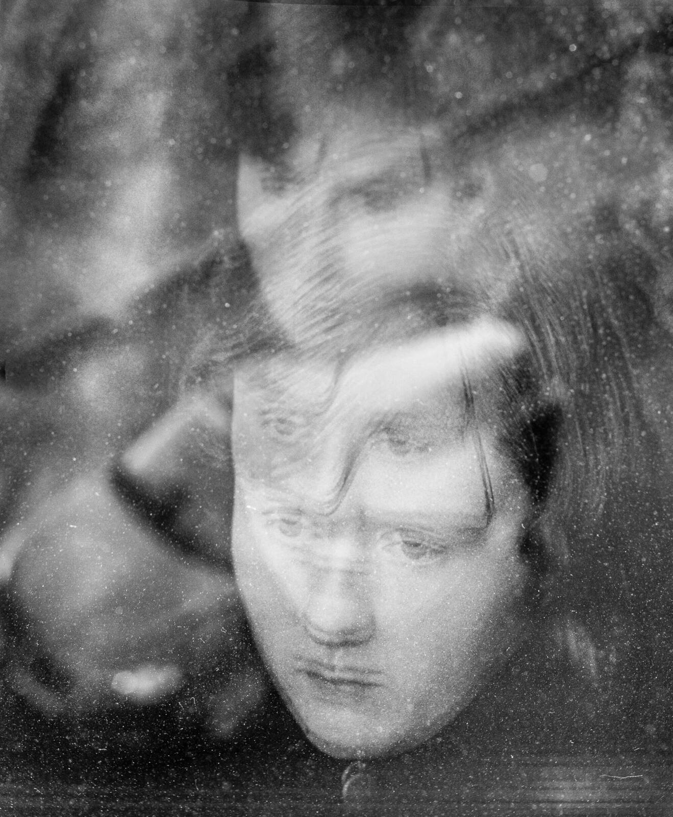 Reflektion av ett 45 år gammalt porträtt. Fönsterglaset har nog putsats sedan dess men frågan är när. Det som återkastas från glasytorna är inte enbart den fysiska bilden, även minnen studsar åter.
