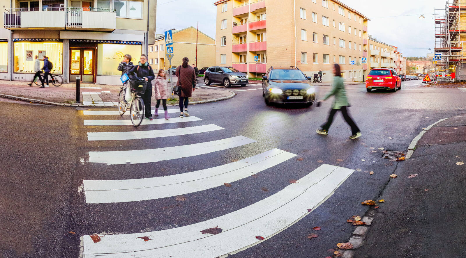 Nej, det här har inte hänt. I alla fall inte samtidigt. Att få till en någorlunda livlig gatukorsning i en svensk mellanstor stad är inte så enkelt. Det är inte nog med folk i farten samtidigt. Jag använde panoramatekniken och stod och lurade tills det hände något, knäppte och väntade lite till, knäpp. Monterar ihop intressanta exponeringar till en bild som ser ut som en dokumentär situation. Det som saknas är tiden mellan händelserna. Tiden är reducerad, nedkokt till ett fiktivt ögonblick. Många handgrepp, flera programvaror, är det värt det för att skapa en falsk vardagsscen? Jag ser det som att slipa en rådiamant. De olika delhändelserna blir som fasetter i bilden av staden, som glänser och förgyller min idé av gatulivet. Behöver jag påpeka att det är roligt också?