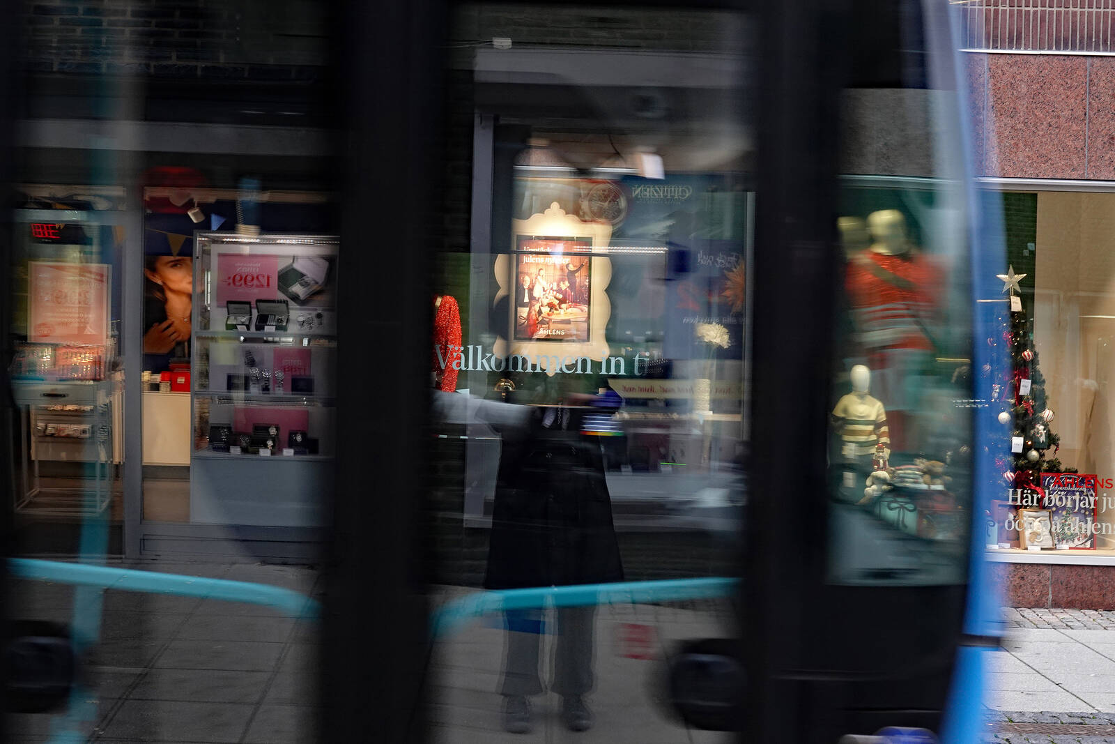 Skynda o Fynda. En buss susar förbi fotografen som bara vill fota ett julfönster. Nya kunder på väg,. Jag stannar upp på trottoaren och tar en bild, blir inramad och ifrågasatt av förbipasserande som tror jag fotade folk utan ok. Andra får hetsa. Jag stannar utanför.