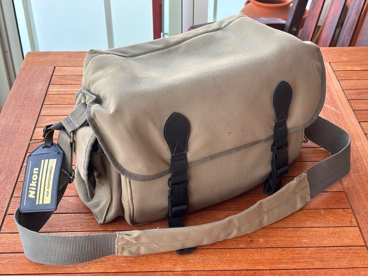 Säljer en Nikon kameraväska tillverkad i tålig canvasmaterial med justerbara fack för kamerautrustning. Bra skick utan skador eller störande fläckar. Tyvärr har emblemet på locket trillat av (se de två små hålen...), annars är allt som det ska.